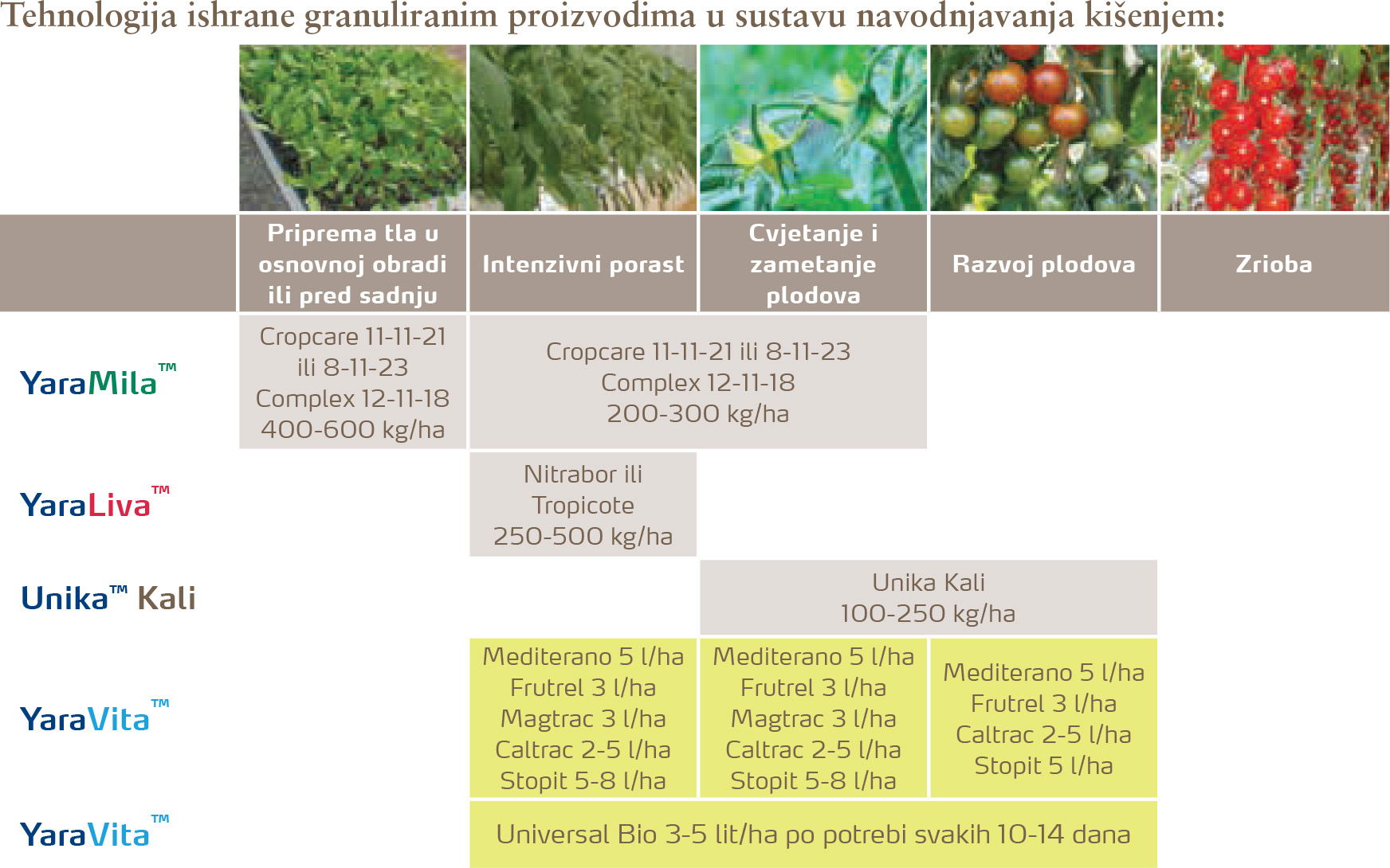 Napomena: Savjetujemo ishranu plodovitog povrća gnojivima koja sadržavaju sulfatni kalij, YaraMila™ Cropcare ili Complex i zbog velike kvalitete i topivosti. Dušik je potrebno dodati do određene količine preko proizvoda YaraBela™ Sulfan ili Extran. I u sustavu kap po kap startnu gnojidbu obavit ćemo YaraMila™ Complex ili Cropcare.